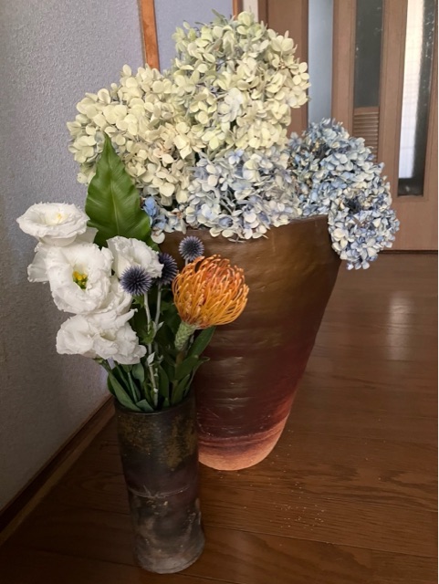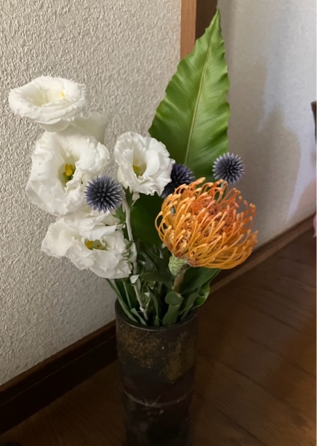 オレンジのお花は、ピンクッションという名前で花言葉は「どこでも成功を」だそうです。